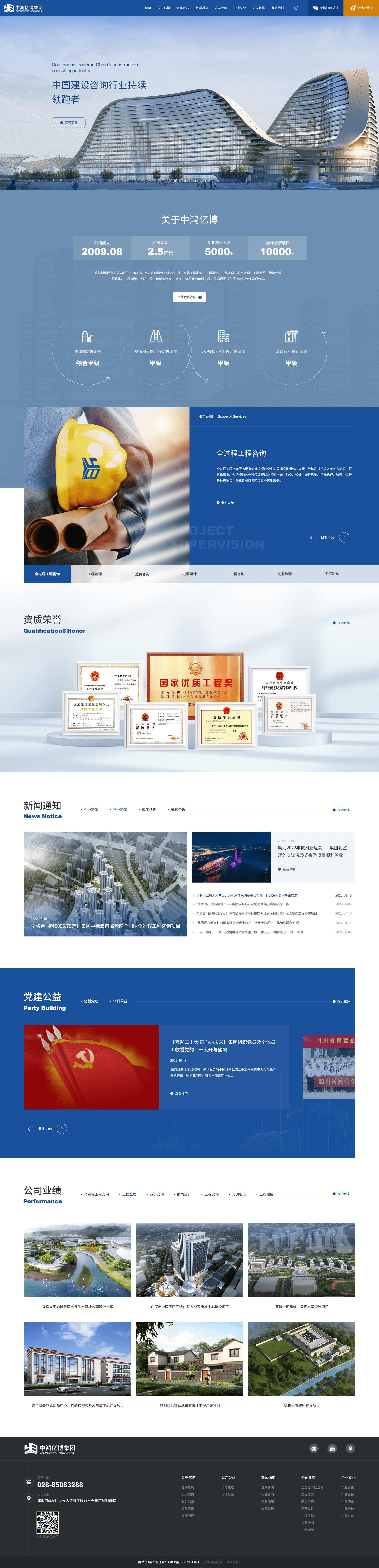 中鴻億博集團(tuán)有限公司成立于2009年8月,注冊資金5000萬元,是一家集項目管理、工程監(jiān)理、造價咨詢、勘察設(shè)計、招標(biāo)代理、工程咨詢、工程測繪、人防工程、BIM咨詢及檢測鑒定于一體的全過程工程管理咨詢綜合服務(wù)商。并于2015年取得工程監(jiān)理綜合資質(zhì)、勘察設(shè)計資質(zhì);2016年取得工程造價咨詢甲級資質(zhì)、工程測繪丙級資質(zhì);2017年取得招標(biāo)代理甲級資質(zhì)、工程咨詢單位甲級資信證書;2018年取得軍工涉密業(yè)務(wù)咨詢服務(wù)安全保密條件備案證書;2020年4月取得水利部水利工程施工監(jiān)理甲級、水土保持工程施工監(jiān)理丙級;2020年7月取得交通運(yùn)輸部(全資子公司)公路工程甲級。